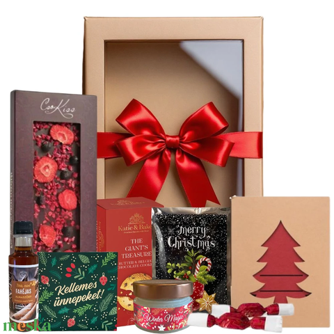 - Anyaga: karácsonyi tea, vajas keksz, karácsonyi evőeszköz tartó, szaloncukor, kézműves szójagyertya, díszcsomagolás