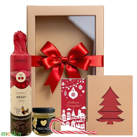 - Anyaga: karácsonyi kézműves csokoládé, termelői akácméz, gyümölcspüré szörp, cukorpálca, karácsonyi evőeszköz tartó, díszcsomagolás
