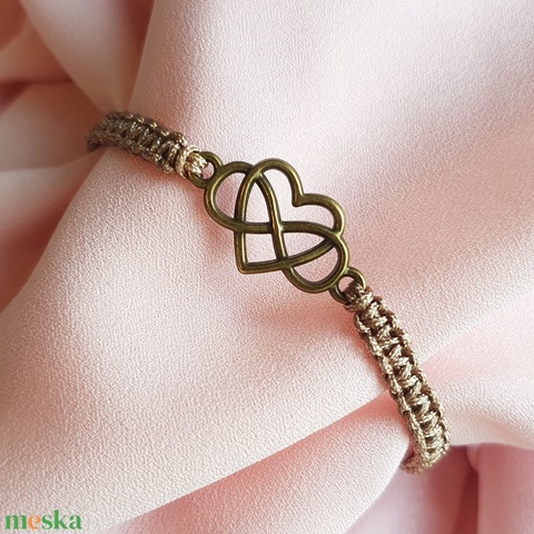 Fonott makramé karkötő - középbarna színben bronz színű szíves medállal