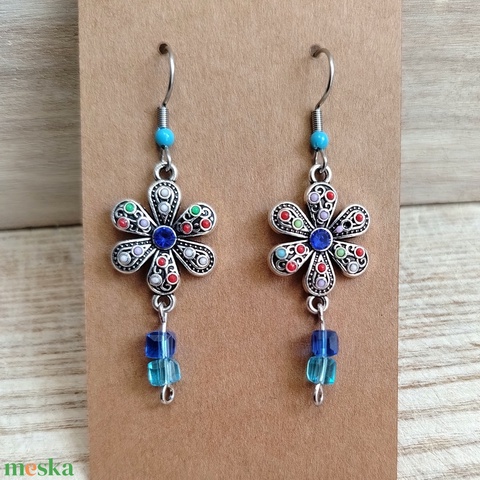 Kék Gyöngyös virágos kézműves fülbevaló