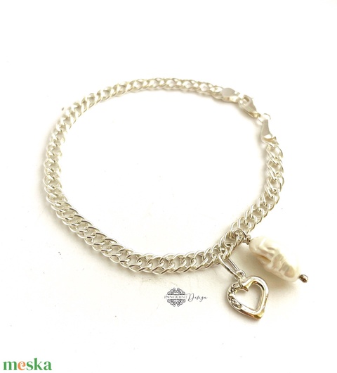 Ezüst karkötő biwa gyönggyel és szivecskével