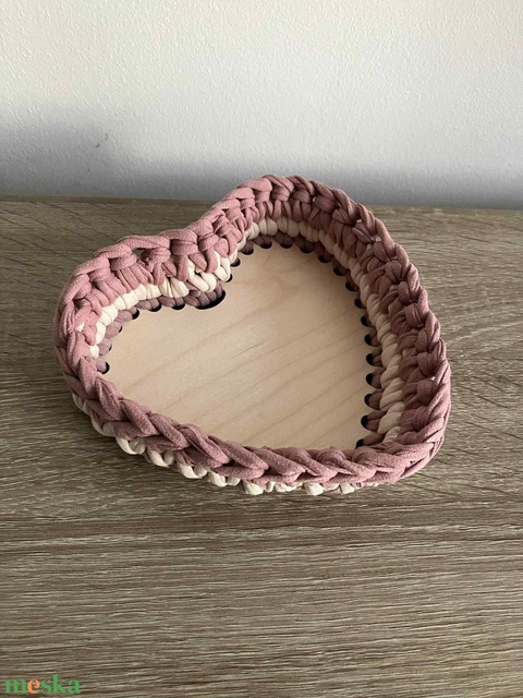 Szív alakú horgolt bonbon kínáló, tároló kosár (három színű)