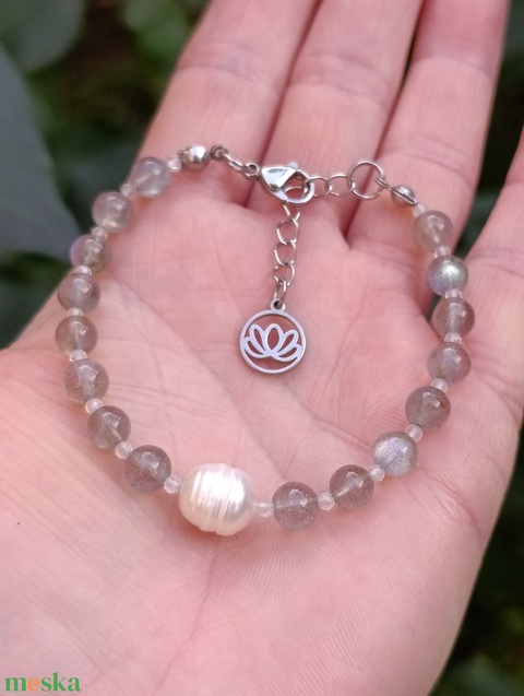 AA minőségű labradorit, hegyikristály és édesvízi gyöngy karkötő Lótusz medállal