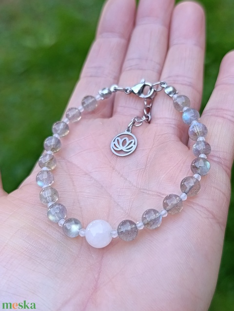 AA minőségű labradorit, hegyikristály és holdkő kapcsos ásványkarkötő Lótusz medállal