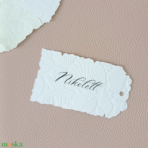 Kagyló mintás, rusztikus hangulatú esküvői ültetőkártya, ajándék címke, felköthető, szalagozható