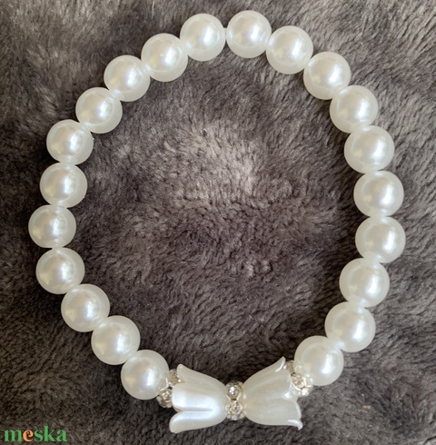 Női karkötő. Hófehér gyöngyökből készült női karkötő két gyöngyvirág dísszel és strassz köves gyöngyökkel