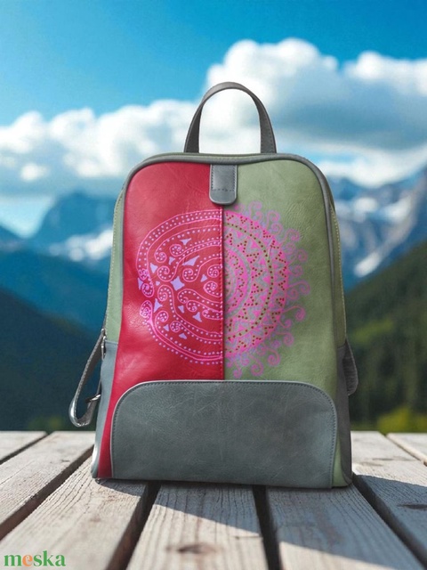 Jól pakolható, erős műbőrből készült kézi/váll, és háti táska. Az elején kézzel festett, egyedi mintával
