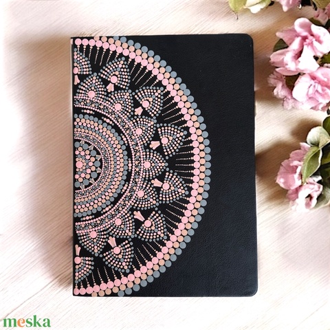 Fekete műbőr jegyzetfüzet szatén fényű szürke, matt bézs és rózsaszín pontmandalával, 20,5x29,5 cm, 80 lapos vonalas