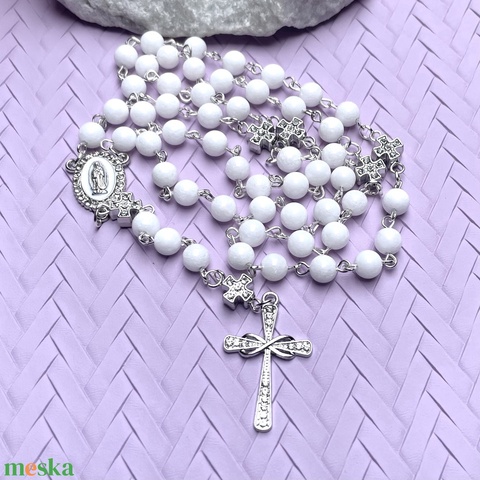 Keresztelő ajándék öttizedes hókvarc / tejkvarc ásvány rózsafüzér díszdobozban 5601979