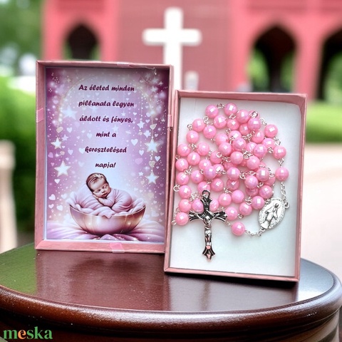 Keresztelő ajándék rózsaszín öttizedes rózsafüzér díszdobozban kísérő szöveggel lány gyermeknek 5601995