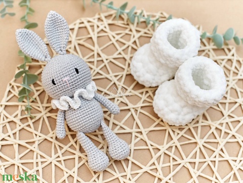 Nyuszis babaköszöntő szett - horgolt babacipő szürke nyuszival