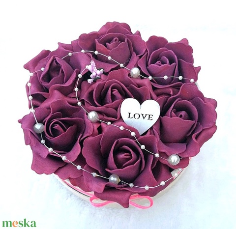 papírdoboz, habrózsa, tűzőhab, szalag, fafelirat, betűző, művirág, csipke