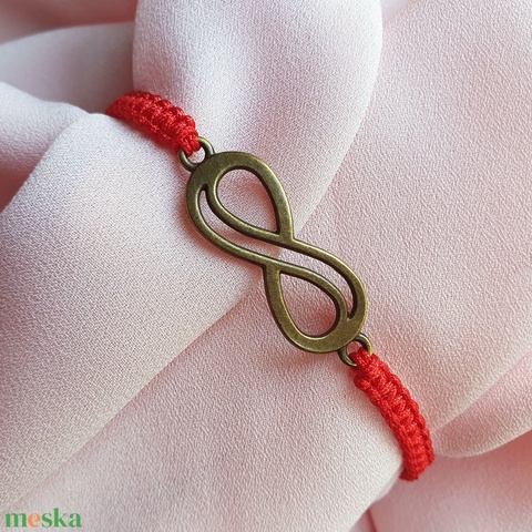 Fonott makramé karkötő, piros, végtelen jel medállal