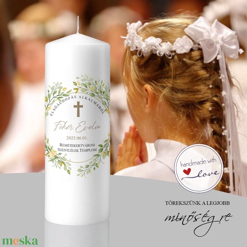 Az Evelin elsőáldozásó gyertya egy ünnepélyes hangulatú, személyre szabható emlékgyertya, amely méltó kísérője a gyermek életének egyik legfontosabb lelki mérföldkövének. A gyertya központi motívuma egy finoman megrajzolt zöldleveles koszorú, amely az élet, a növekedés és a tisztaság szimbóluma. A kör formája az örökkévalóságot és az isteni szeretet folytonosságát idézi, míg a belsejében elhelyezett arany kereszt az elsőáldozás szentségére utal.