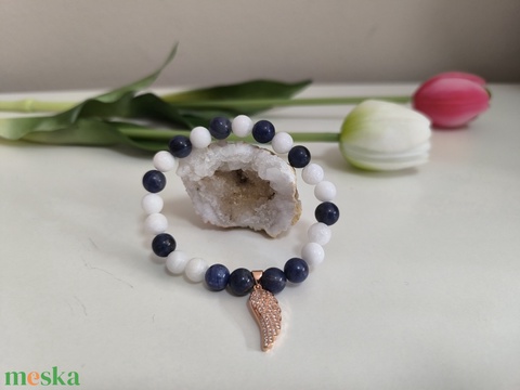 Szodalit és Tejkvarc ásványkarkötő, Rosegold színű angyalszárnnyal díszítve
