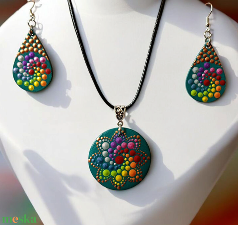 Szivárványspirál pontozott mandalás ékszerszett - türkiz