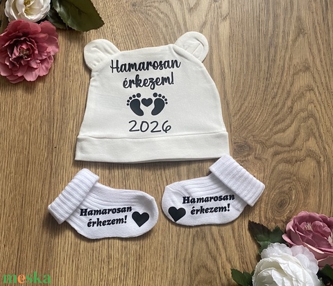 Baba bejelentő zokni és sapka- egyedi felirattal, apukának, nagyszülőknek, rokonoknak, barátoknak