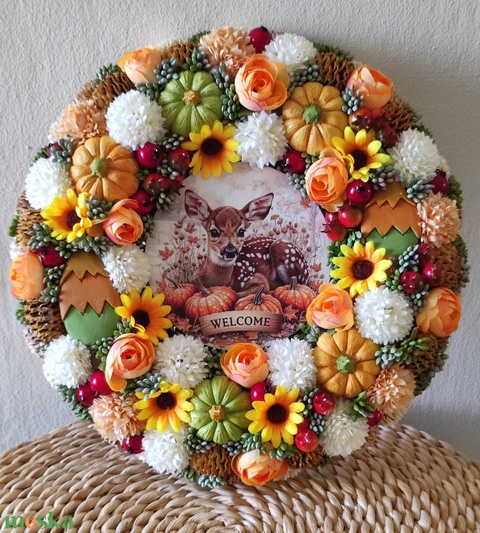 - Anyaga: selyemvirág, műzöld, száraz termés, gipsz figurák, fadekor, tök