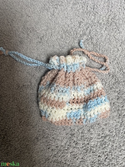 Horgolt kézzel készített zsák ami tökéletes kisebb tárgyak tárolásához .