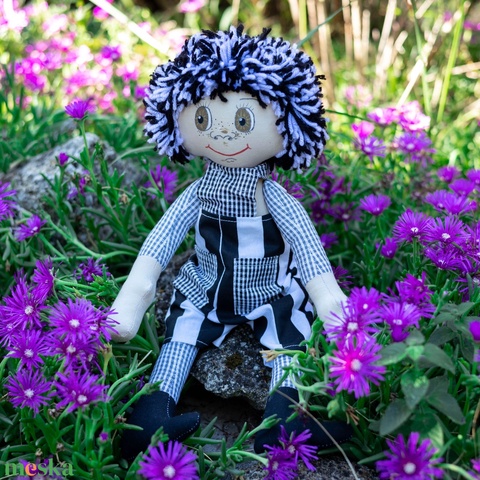 Fekete-fehér textil baba, fiú – öltöztethető, mozgatható végtagokkal, festett arccal, 40cm