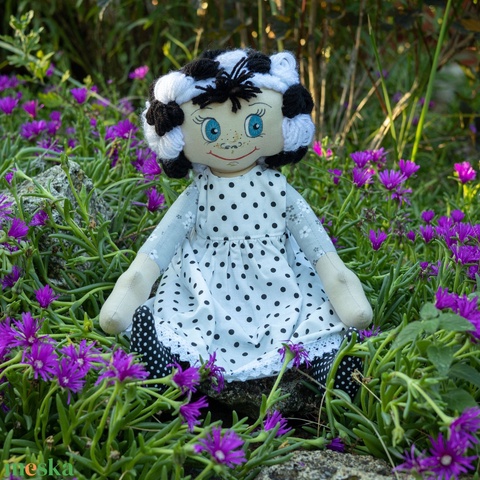 Fekete-fehér textil baba, lány – öltöztethető, mozgatható végtagokkal, festett arccal, 40cm