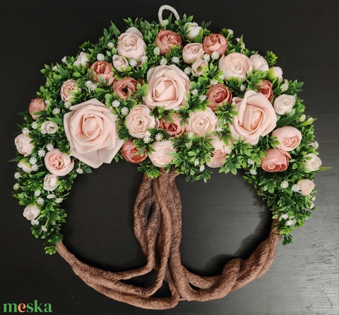 Rózsaszín virágokkal készült tavaszi Életfa (Tündérfa) kopogtató
