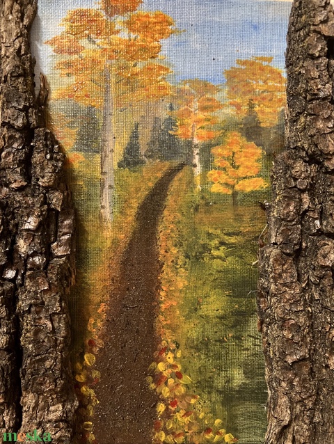 Őszi erdei ösvény festmény – rusztikus fali dekoráció valódi fakéreg keretben – akril tájkép, egyedi kézműves ajándék