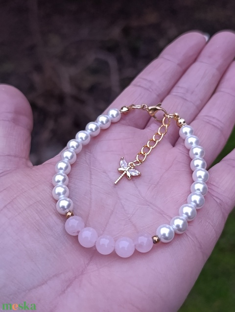 Rózsakvarc és kagylógyöngy kapcsos karkötő szitakötő medállal