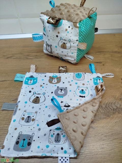 Maci mintás címkerongyi+puha csörgő címkekocka szett
