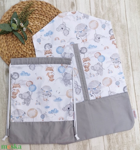 Óvodai Szett 2 db-os - Ruhazsák és tornazsák "Elefánt, róka, koala lufival"- szürke