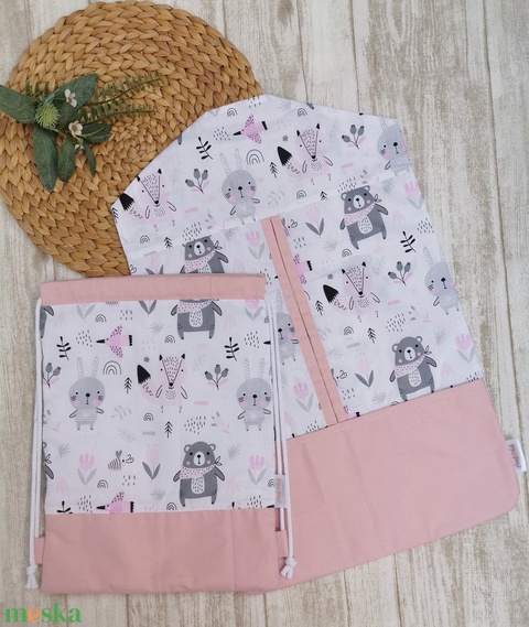 Óvodai Szett 2 db-os - Ruhazsák és tornazsák "rózsaszín-szürke macis nyuszis"- rózsaszín