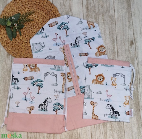 PRÉMIUM Óvodai Szett 3 db-os - Ruhazsák, tornazsák és tisztasági zsák "állatkert"- rózsaszín