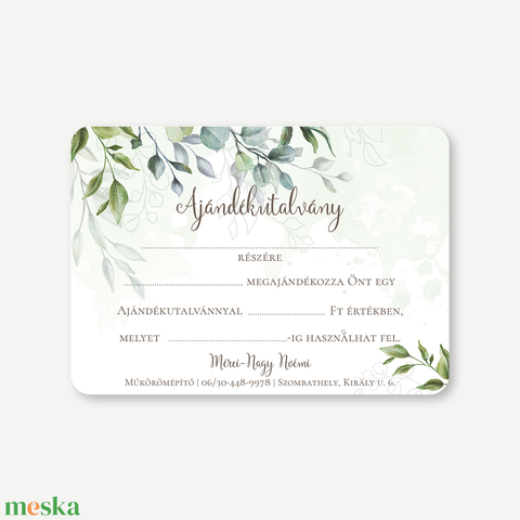 A Boho Greenery kollekció egyoldalas, A6 méretű ajándékutalványa természetközeli, akvarell hatású zöldleveles grafikával készült, amely friss, letisztult és harmonikus megjelenést biztosít. Kiváló választás minden szolgáltató vállalkozás számára, amely szeretné, hogy ügyfelei igényes, esztétikus formában tudják ajándékba adni szolgáltatásaikat.