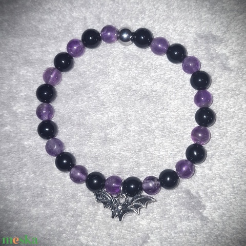 Denevér medálos ametiszt és ónix ásványkarkötő