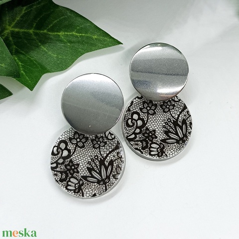 Fekete csipke mintás medálos nemesacél beszúrós fülbevaló