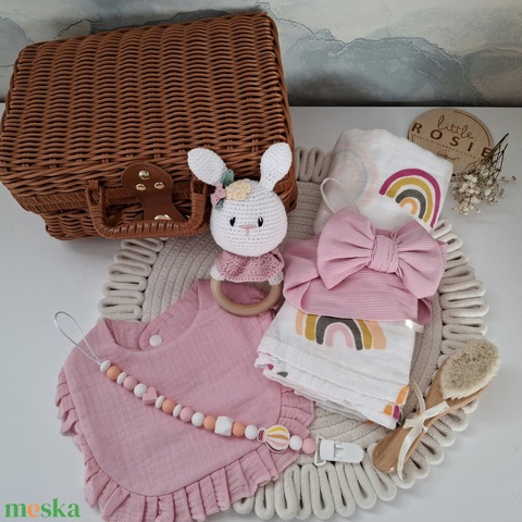 Nyuszis babalátogató ajándékcsomag bőröndben