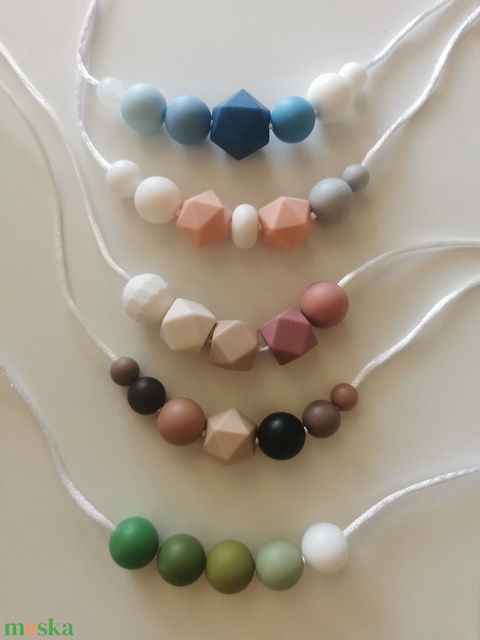 szilikon gyöngy, szatén zsinór, műanyag csat