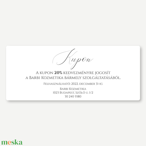 A Pure White kollekció kuponja a letisztult elegancia megtestesítője. Minimalista design, hófehér háttér és finom tipográfia gondoskodik arról, hogy a kupon minden részletében professzionális és ízléses benyomást keltsen. Egy igényes kártya, amely tökéletesen illik modern szalonokhoz, üzletekhez és szolgáltatásokhoz.