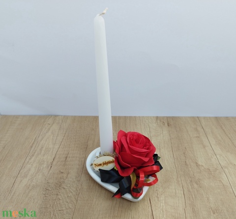 gipsz szív, gyertya, selyemvirág, szatén szalag, fa tábla