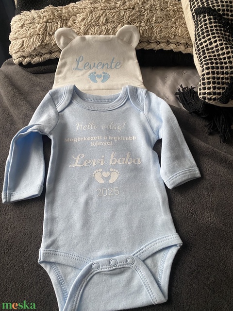 Egyedi babaköszöntő ajándék csomag, baba sapka és body személyre szabható felirattal, díszdobozban