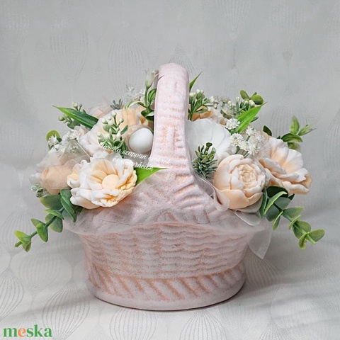 - Anyag/Összetevő szappan, organza, művirág, ragasztópisztoly, oázis