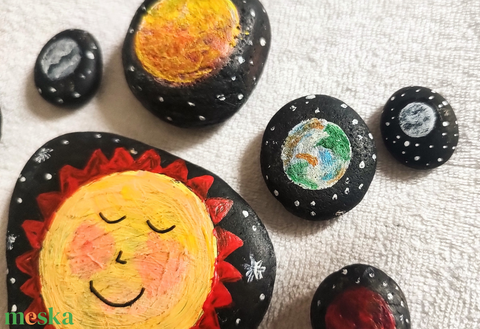 Kézzel festett nap körül keringő bolygós kavicsok - világűr, naprendszer