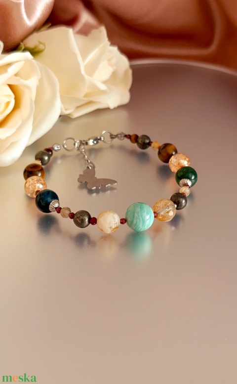 - Anyag/Összetevő acélsodrony, pirit, arany aura kvarc, amazonit, mohaachát, tigrisszem, gránát, arany rutilkvarc