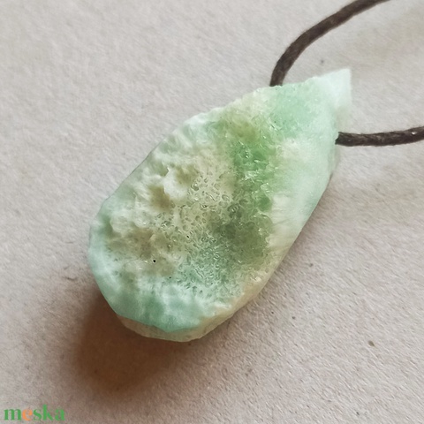 Nyers zöld aragonit medál átfúrva és pamutszálra fűzve, aragonit, Natúr ásvány.