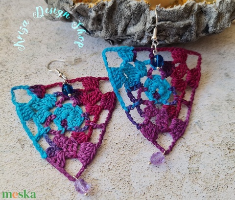 Kézműves horgolt csipke fülbevaló gyönggyel (Enikő - Lila-türkiz színek)