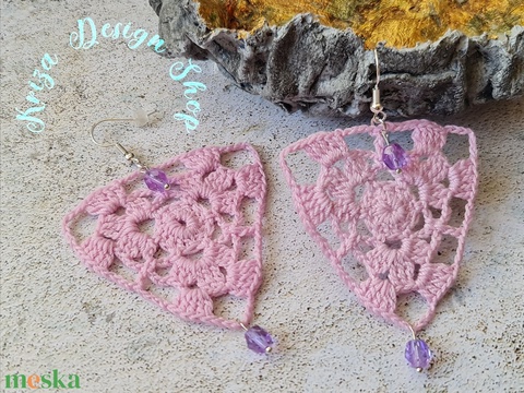 Kézműves horgolt csipke fülbevaló gyönggyel (Enikő - Orchidea szín)