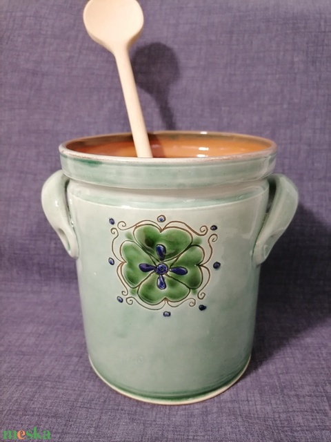 - Anyaga: vörösre égő agyag, színtelen ólommentes máz, fehér engób, zöld máz