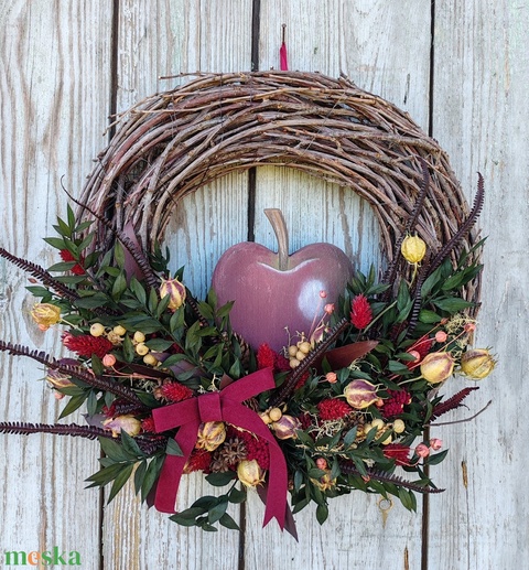inda koszorú, drót, szalag, fa alma, ruscus, nigella, len, páfrány, fénymag, achillea