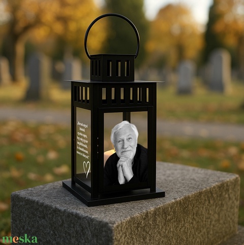 Elegáns, fekete színű fémlámpás UV nyomtatott üveglappal, mely megható verssel emlékezik meg az eltávozott szerettekről. Tökéletes sírdísz, megemlékezés vagy otthoni emlékhely részeként. A mécsestartóban elhelyezett gyertya fénye meghitt hangulatot teremt, míg a szöveg örök emléket állít. Strapabíró fémszerkezetének és minőségi kivitelének köszönhetően hosszú ideig megőrzi szépségét.