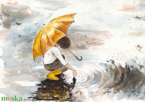 Sárga esernyő 3. - akvarell nyomat, A4-es méretben - kedves illusztráció, lakásdekoráció gyerekszobába